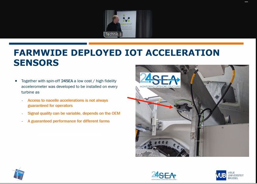 Christof Devriendt, representing 24SEA, delivered a technical presentation titled «The Use of Physics and Data-Driven Digital Twins Combined with Farmwide Deployed IoT Acceleration Sensors.» The presentation focused on a case study within the WILLOW Project, highlighting the integration of advanced monitoring technologies and digital twin models for enhanced wind farm management.